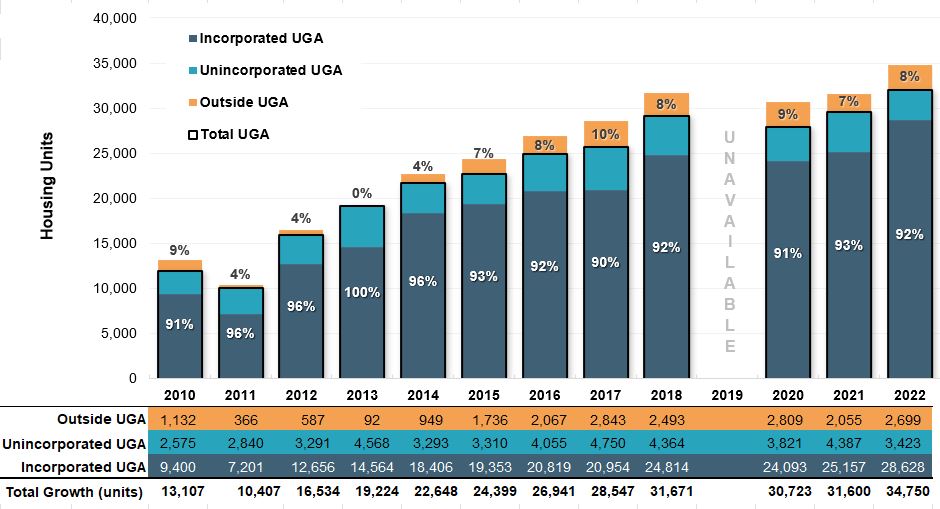 This indicator tracks the percentage of total new housing growth located within urban growth areas. Prioritizing development in urban growth areas can help protect natural lands outside urban areas. This indicator is one way to assess progress channeling growth into urban growth areas.