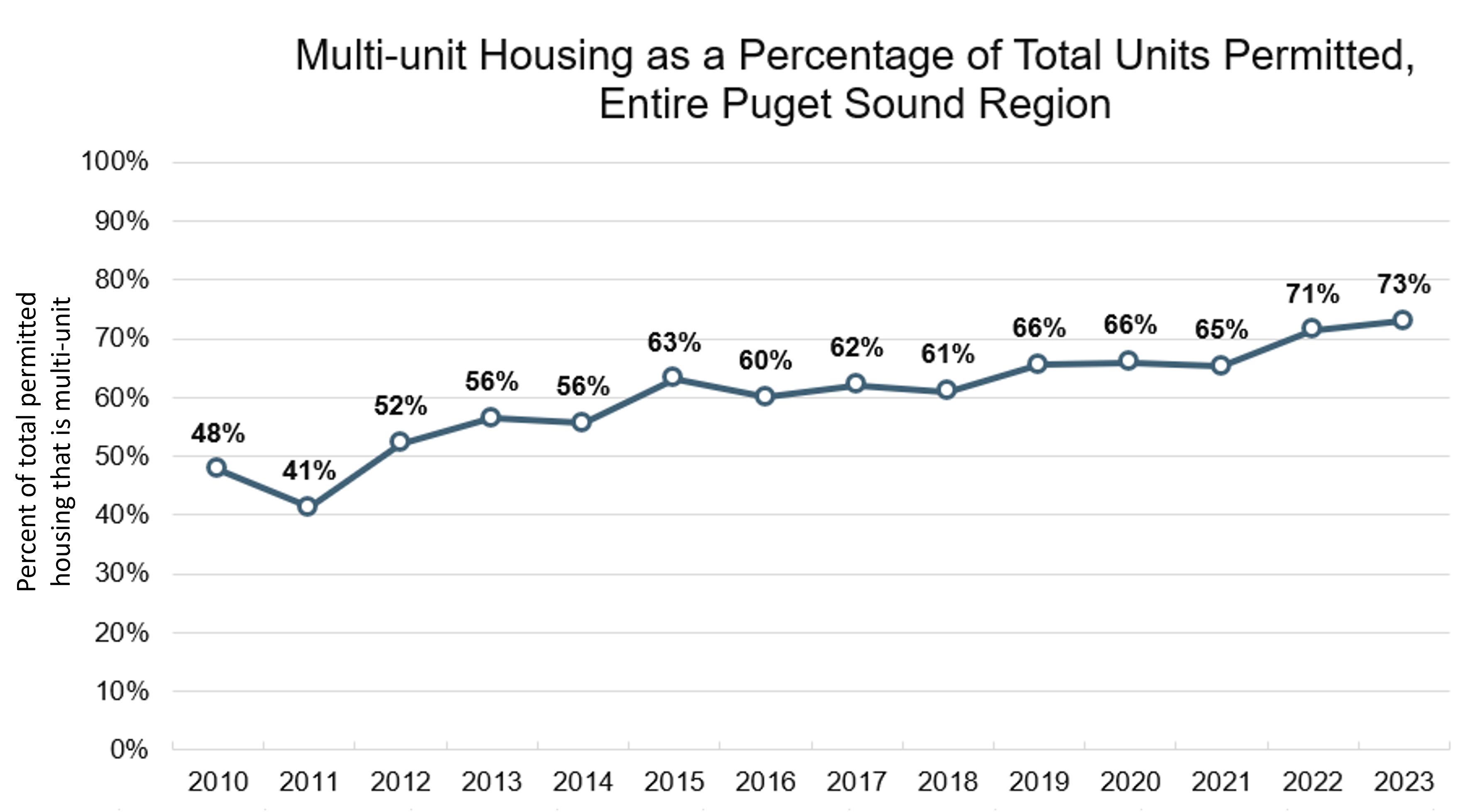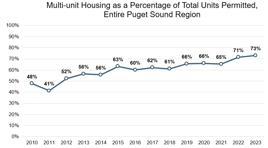 This indicator measures the percentage of total new housing production that is multi-unit (e.g., apartment buildings, condominiums, townhomes, etc.). Multi-unit housing types require less land area for each new unit than single-unit options, thus helping to conserve forest lands, open spaces, agricultural lands, and other natural ecosystems in Puget Sound. This indicator, measured at the city, town, and county level, can help local planners evaluate how their policies support a variety of housing options.