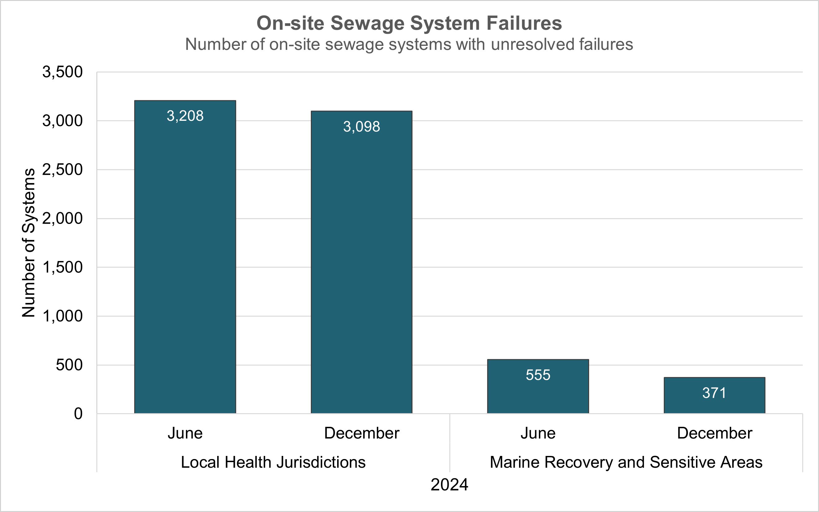 This indicator measures the number of small on-site sewage systems (OSS) with an identified and unresolved failure (“failures”). Failures range in severity and potential for environmental and public health harm, though typically more severe failures are reported. This indicator helps us track and manage failing OSS, which are a leading pressure impacting water quality and shellfish bed health in Puget Sound.