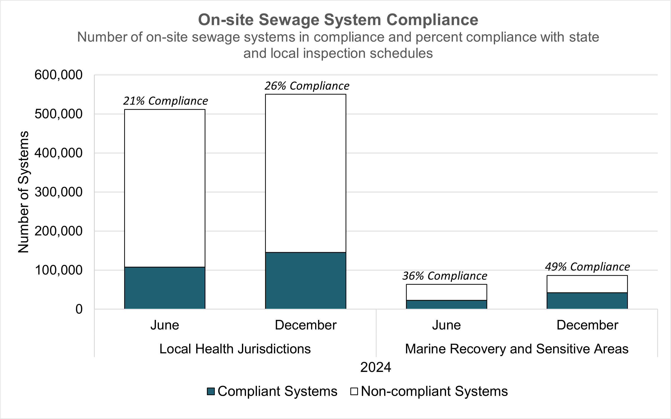 This indicator measures the number of small on-site sewage systems compliant with state and local inspection schedules. Compliant OSS that are routinely inspected ensure the system is used and operating as designed. These OSS do not pose a risk to human or environmental health and will not impact nearby water quality and shellfish beds. This indicator helps us evaluate trends in the number of OSS that are compliant with state and local inspection requirements.