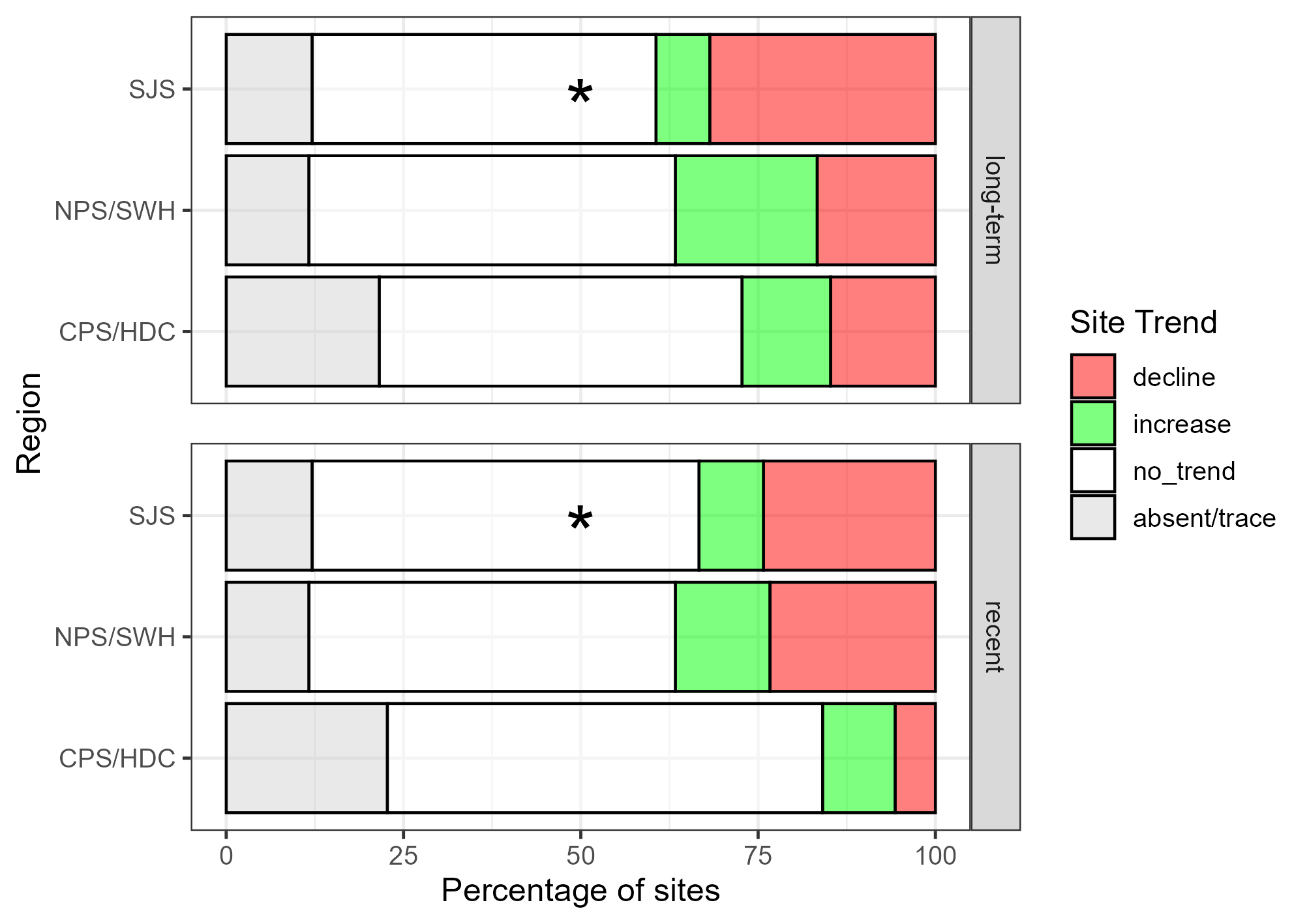 Trends in eelgrass area at 214 randomly selected sites in greater Puget Sound. Horizontal bars show the percentage of all sites with eelgrass declines (red), increases (green), no trend (white), trace eelgrass or no eelgrass (grey). Site trends are shown for 3 regions of greater Puget Sound: San Juan Islands and Strait of Juan de Fuca (SJS), Northern Puget Sound and Saratoga Whidbey Basin (NPS/SWH), and Central Puget Sound and Hood Canal (CPS/HDC). The top part of the graph shows long-term trends (based on all data between 2000 and 2023). The bottom part is based on data from 2018-2023 (recent trends). The star indicates there is a significant difference between the number of increasing and declining sites for the region as a whole (not just in the selected sample).