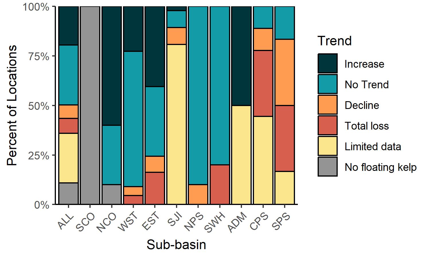 The indicator assesses long-term trends in the extent of canopy-forming kelp forests at sampling locations throughout Washington State by tracking the area of kelp beds on the water surface. Results at each location are considered in conjunction with other information to determine an overall assessment of floating kelp status within 11 sub-basins defined by oceanography.