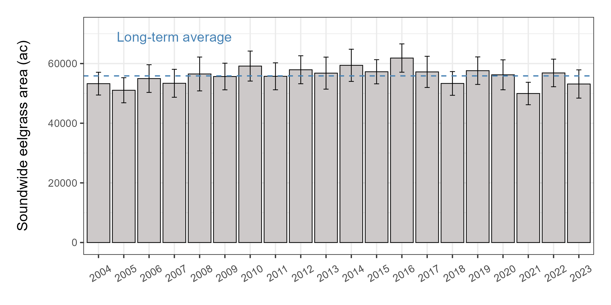Soundwide eelgrass area is a metric for the overall health of native seagrass beds in greater Puget Sound. Seagrass is an important component of nearshore habitats and is sensitive to human disturbance and declines in water quality.