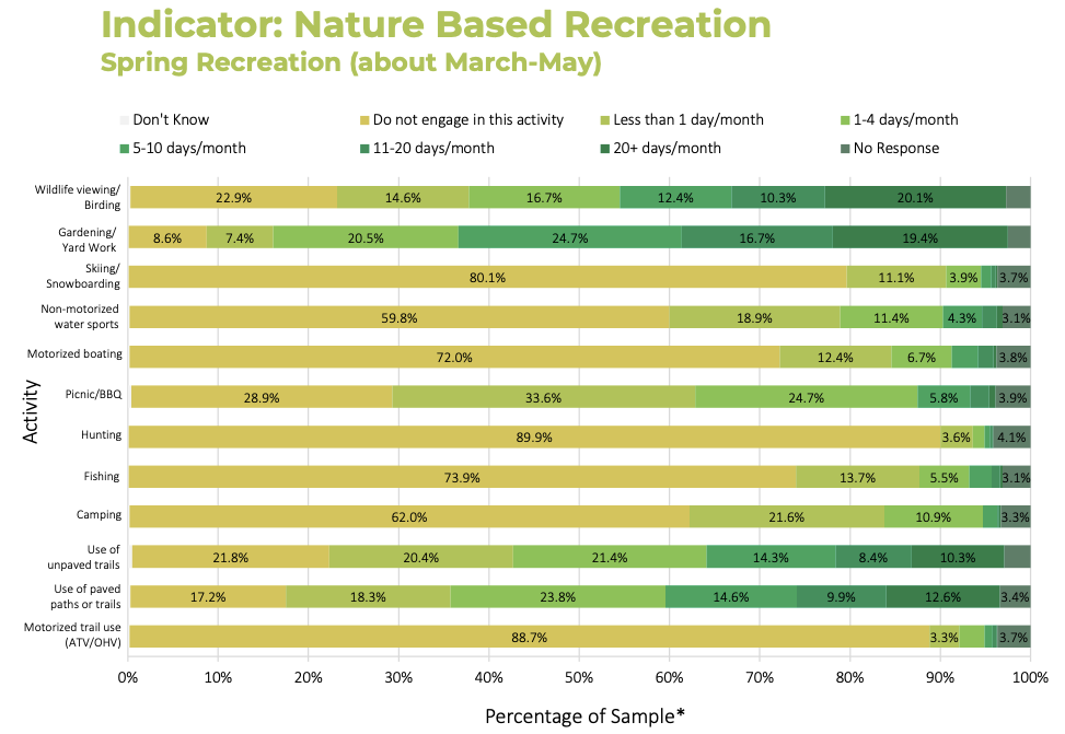 This indicator tracks participation in nature-based recreation in the Puget Sound region during winter, spring, fall and summer seasons. Recreational activities tracked are limited to those within the scope of Puget Sound recovery and include both passive and active recreational activities, such as wildlife-watching, fishing, bicycling, boating, and swimming.