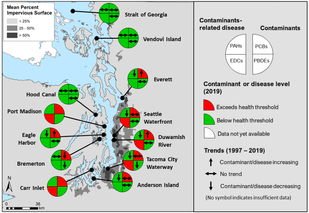 The contaminants in adult Chinook salmon indicator measures levels of two toxic contaminants, PCBs and PBDEs, in edible muscle tissue (fillet) of maturing Chinook salmon that reside in Puget Sound. Levels of PCBs and PBDEs in resident Chinook salmon indicate the amount of these contaminants to which humans and other predators like Southern Resident killer whales may be exposed to when eating these salmon, as well as potential impairments to salmon health that may limit their recovery.