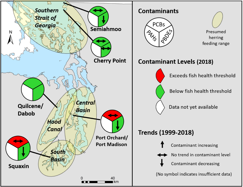 The contaminants in Pacific herring indicator currently tracks the concentration of PCBs and PBDEs in the whole bodies of herring. The levels of these persistent organic pollutants (POPs) in herring signal not only harmful concentrations in this species, but also the extent of contamination in the pelagic food web. POPs threaten the health of herring and other forage fish, the health of the fish, wildlife and humans who consume them, and the overall productivity of the pelagic habitat.